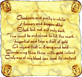 fter several hours of discussion, we came up with a possible meaning. Silverast said, "The two dragons and myself must unite. Please hold hands but no one must touch the book." He motioned for me to stand in front of the three of them and wait until the magic was dispelled to open the book. |